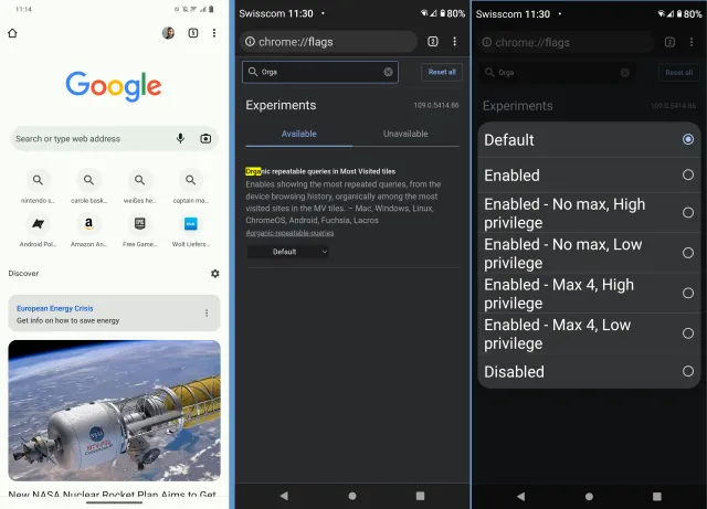 Quelle: Androidpolice.com (links), PCtipp.chFalls Sie jedoch verhindern wollen, dass Chrome Ihnen diese anzeigt, deaktivieren Sie das Experiment. Öffnen Sie hierzu in Chrome die Webadresse chrome://flags/#organic-repeatable-queries. Sie können auch bloss chrome://flags/ öffnen und dort nach organic suchen. Damit erscheint eine Einstellung namens «Organic repeatable queries in Most Visited tiles». Tippen Sie auf Default und schalten Sie auf Disabled um. Anschliessend bittet Chrome um einen Neustart, den Sie ihm erlauben.