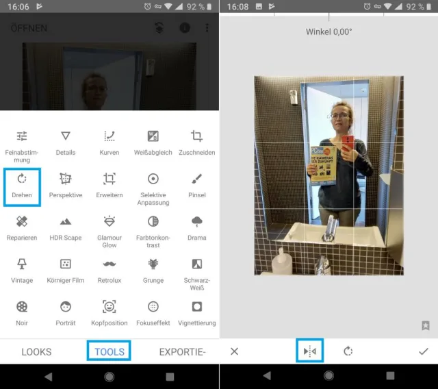 Snapseed: «Tools/Drehen» und das Spiegeln-Icon benutzen
