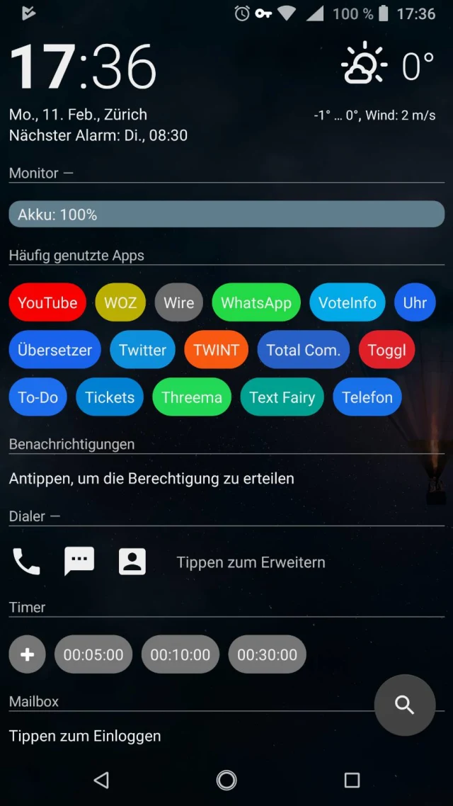 Quelle: PCtipp.chEin merkwürdiges, aber interessantes, minimalistisches Konzept verfolgt AIO Launcher (go.pctipp.ch/aiolaunch). Statt Icons erscheinen nur Buttons und Inhalte auf dem Homescreen – und zwar viele davon. Es gibt nur eine Bildschirmseite, die sich nicht horizontal, sondern vertikal durchscrollen lässt. Kalender, Mails, Twitter, Wechselkurse: Alles ist in Form direkt nutzbarer Widgets zugriffsbereit. Es gibt auch eines, um einen Timer zu starten oder für Sprachaufnahmen, Bild 7.
