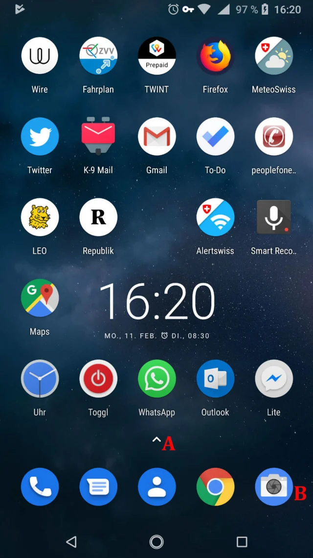 Quelle: PCtipp.chWelcher Launcher beim Kauf eines Android-Smartphones vorinstalliert ist, hängt vom Hersteller ab. Asus, BQ, Sony, Xiaomi etc. setzen zum Beispiel eigene Launcher ein. Andere greifen zum mit Android mitgelieferten Launcher3 oder (unter Android Pie) zu Quickstep, Bild 1, dessen Google-Leiste (A) man nicht ausblenden kann. Die App-Icons sind hier auf rund eingestellt. Per Wisch von unten öffnen Sie die App-Schublade, die sämtliche vorhandenen Apps auflistet. Die unterste App-Zeile ist das Dock mit fünf fest installierten Apps, auf die man auch beim Blättern auf die benachbarten Bildschirmseiten Zugriff hat. So ähnlich funktionieren viele Launcher.