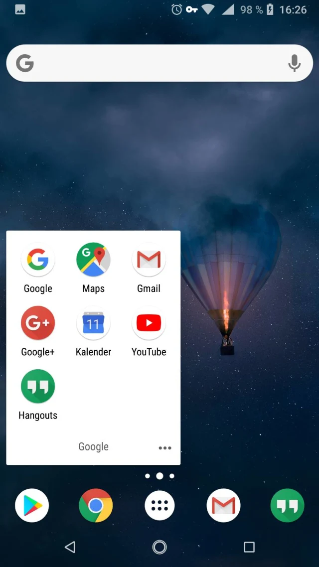 Quelle: PCtipp.chDer Nova Launcher (Download unter der Adresse go.pctipp.ch/novalaunch) bringt wahlweise eine helle oder dunkle Oberfläche mit. Die Icons sind rund und es werden auch App-Ordner unterstützt, wie hier zum Beispiel mit Google-Apps, Bild 3. Das mittlere Icon unten in der Dock-Leiste ist die App-Schublade, die alle installierten Apps auflistet. Das Anbringen von Widgets (etwa ein Ausschnitt aus dem Kalender oder eine Wetterübersicht) ist ebenfalls kein Problem. Nova dürfte der beliebteste alternative Launcher sein. Wer mit dem vom Hersteller vorinstallierten Launcher nicht zufrieden ist, wird wohl als Erstes den Nova Launcher ausprobieren – und nicht selten auch gleich bei dem hängen bleiben. Die kostenpflichtige Version ist Nova Launcher Prime (go.pctipp.ch/novaprime). Sie bietet zusätzlich zur kostenlosen Version ein paar weitere Funktionen. Dazu gehören eine erweiterte Gestensteuerung, ein Zähler zu ungelesenen Nachrichten oder App-Ordner. Installieren Sie zuerst die kostenlose Version. Der Kauf der kostenpflichtigen Version schaltet bei dieser dann die erweiterten Funktionen frei.