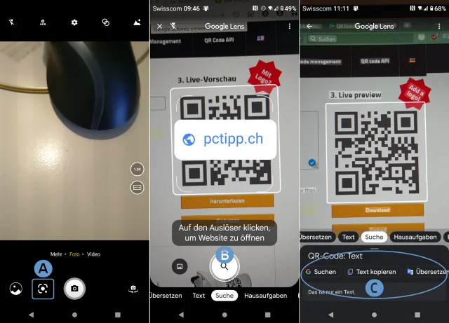 Öffnen Sie Ihre Kamera-App. Wechseln Sie unten zum Google-Lens-Symbol, siehe ersten Screenshot (A). Halten Sie das Smartphone so, dass der QR-Code ins weiss markierte Viereck zu liegen kommt. Ist der Inhalt des QR-Codes eine Webadresse, erscheint diese mitten im Display. Tippen Sie direkt auf den angezeigten Link oder auf den Auslöse- bzw. Suchen-Knopf, siehe mittleres Bild (B).