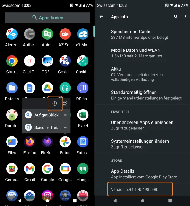 App-Version: Soll es die genaue Versionsnummer einer App sein, finden Sie diese nicht immer in der normalen Bedienoberfläche der App. Aber über die App-Liste oder die Home-Screen-Verknüpfung der App gehts fix: Falls die App irgendwo auf Ihrem Homescreen verknüpft ist, tippen Sie etwas länger auf diese Verknüpfung. Falls die App nur in der App-Schublade steckt, die beim Wischen vom unteren Rand erscheint, tippen Sie etwas länger aufs dortige Symbol der fraglichen App.