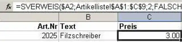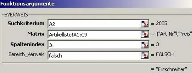 Suchkriterium ist die Artikelnummer in der vorliegenden Liste. Die Matrix ist der Tabellenbereich ihrer vorgefertigten Artikelliste. Der Spaltenindex bezeichnet die Spaltenzahl, deren Inhalt zurückgegeben werden soll. Für den Preis ist dies hier also die dritte Spalte = 3. Bei "Bereich_Verweis" müssen Sie unbedingt "Falsch" eintragen, wenn Sie den exakten Wert zurückerhalten wollen. Solle das Suchkriterium in der Liste nicht vorhanden sein, wird der Fehlerwert #NV ausgegeben.