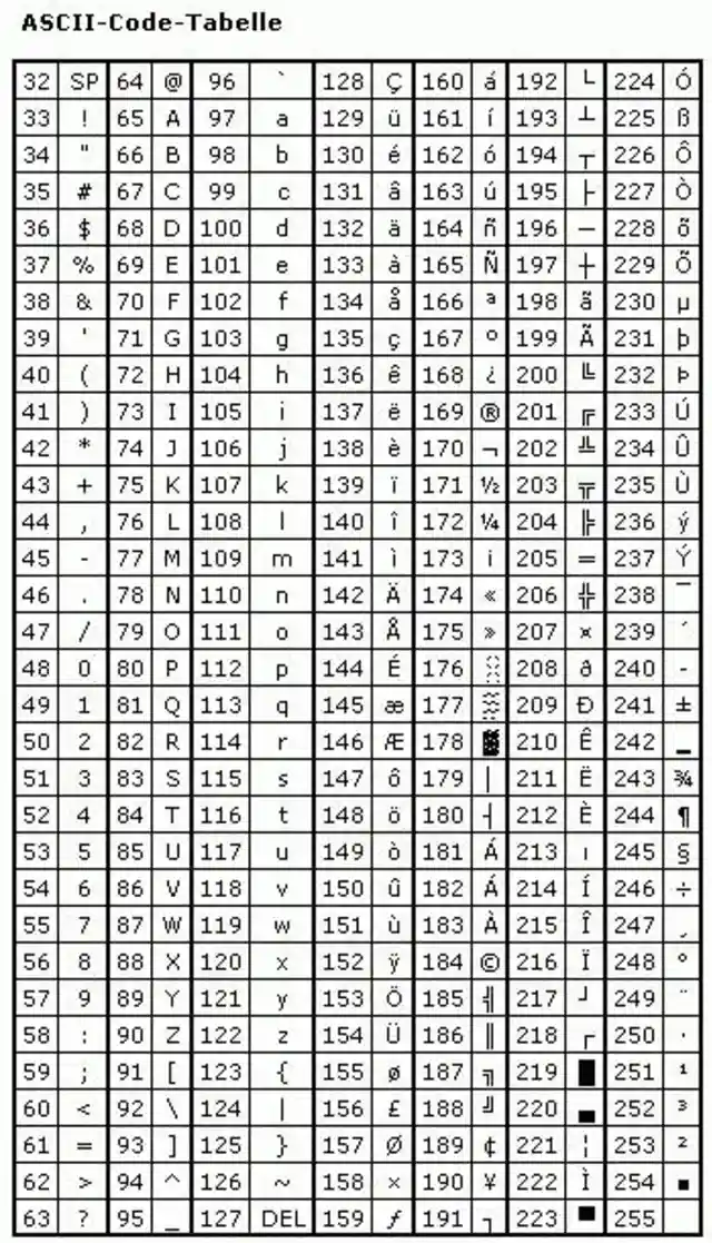 Im Folgenden finden Sie eine Tabelle, welche die ASCII-Zeichen mit ihrem Dezimalcode für die Eingabe enthält. Die ersten 32 Zeichen - da der ASCII-Code bei «0»beginnt, sind das die Zeichen 0-31 - sind die sogenannten «nicht druckbaren Zeichen» oder «Steuerzeichen», diese Zeichen sind lediglich zur Steuerung von Geräten, wie beispielsweise Druckern, vorgesehen. Deshalb sind sie in der folgenden Tabelle nicht aufgeführt. Die Tabelle beginnt mit dem Zeichen 32, das ist das Leerzeichen.