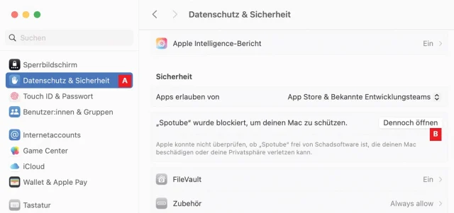 Mit macOS 15 'Sequoia' wurde die Gangart von Apple ein wenig verschärft. Den Befehl Öffnen im Kontextmenü gibt es nicht mehr. Um eine «wilde» Anwendung trotzdem zu starten, öffnen Sie in den Systemeinstellungen den Bereich Datenschutz & Sicherheit, Bild 2 A. Hier finden Sie die verdächtige Anwendung und dazu die Schaltfläche Dennoch öffnen B, um sie entgegen allen gutgemeinten Warnungen trotzdem zu starten.