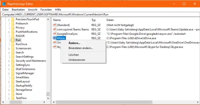 Zum Löschen des Eintrags klicken Sie in der rechten Fensterhälfte mit der rechten Maustaste auf den Eintrag des betroffenen Programms (bei uns jener mit «kdrive.exe») und benutzen im Kontextmenü den Befehl Löschen. Damit verschwindet der Eintrag auch aus der Autostart-Liste im Task-Manager.