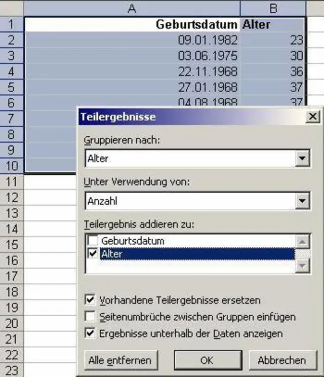 Danach können Sie mit "DATEN/TEILERGEBNISSE" Anzahl pro Alter ermitteln. Damit "Teilergebnisse" korrekt funktioniert, müssen Sie die ermittelten Alterszahlen erst sortieren. Markieren Sie dann den Bereich der berechnet werden soll und wählen Sie im Menü DATEN den Punkt "Teilergebnisse" und nehmen die Einstellungen wie im folgenden Beispiel Vor. Die Spalte um die es uns hier geht heisst "Alter".
