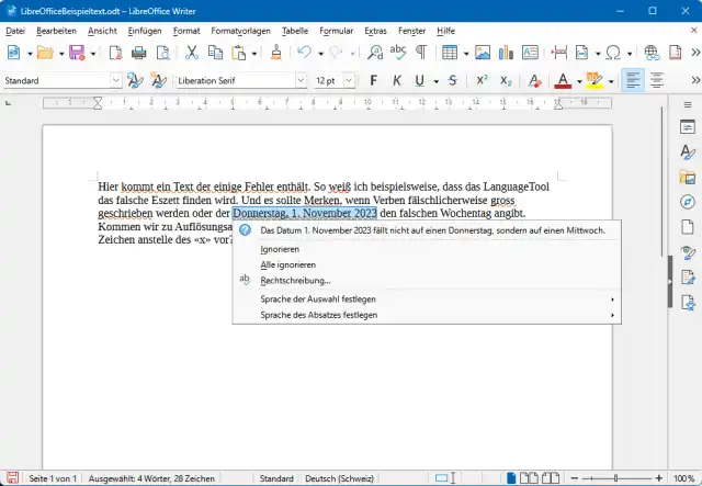 Quelle: PCtipp.chFertig! Das Tool bemerkt das fehlende Komma, das in der Schweiz unübliche Eszett (ss) sowie weitere Fehler und Unstimmigkeiten – bis hin zur falschen Datums-/Wochentagskombination. Interessant finden wir die kleinen Unterschiede bei der Fehlererkennung in Word und LibreOffice. In Word wird bei einer Angabe der Display-Auflösung korrekterweise das Ändern des Buchstabens «x» in ein «×» empfohlen, in LibreOffice fehlt der Vorschlag.