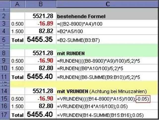 Sie können auch die Funktion "VRUNDEN" verwenden, achten Sie aber darauf, dass bei Minus-Zahlen auch bei "Vielfaches" in der Formel ein Minus eingetragen wird (z.B. -0.05).