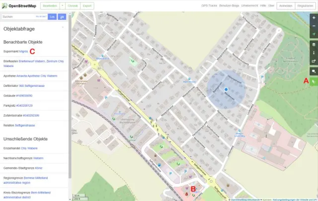 Klickt man auf das Symbol und danach auf ein beliebiges Objekt B, erhält man links im Browserfenster eine Liste mit allen Informationen zu den umliegenden Objekten, zum Beispiel zu Supermärkten, Standorten von Defibrillatoren, Strassen und vielem mehr. Die Objekte werden angezeigt, wenn man mit der Maus über die Liste fährt. Zu jedem Objekt gibt es zusätzliche Informationen wie Öffnungszeiten oder allfällige weiterführende Infos, wenn man auf den Link klickt C.