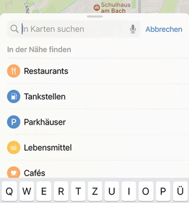 Quelle: PCtipp.chWer kennt das nicht: Man möchte in einer fremden Stadt möglichst schnell eine Apotheke, eine Tankstelle oder eine Margarita finden – aber natürlich möglichst in der Nähe. Auch dabei kann Karten behilflich sein: Tippen Sie in das Suchfeld – jedoch ohne dazu eine Eingabe zu machen, Bild 5. Wischen Sie nach unten, um etwa sämtliche Tankstellen in der Nähe anzuzeigen.