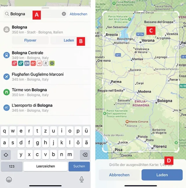 Verwenden Sie das Suchfeld, Bild 4 A, um eine grössere Stadt in der Nähe des Ziels zu suchen und tippen Sie auf die Schaltfläche Laden B. Bestimmen Sie den Ausschnitt C, während Ihnen Karten unten anzeigt, wie viel Speicher dafür belegt wird D.
