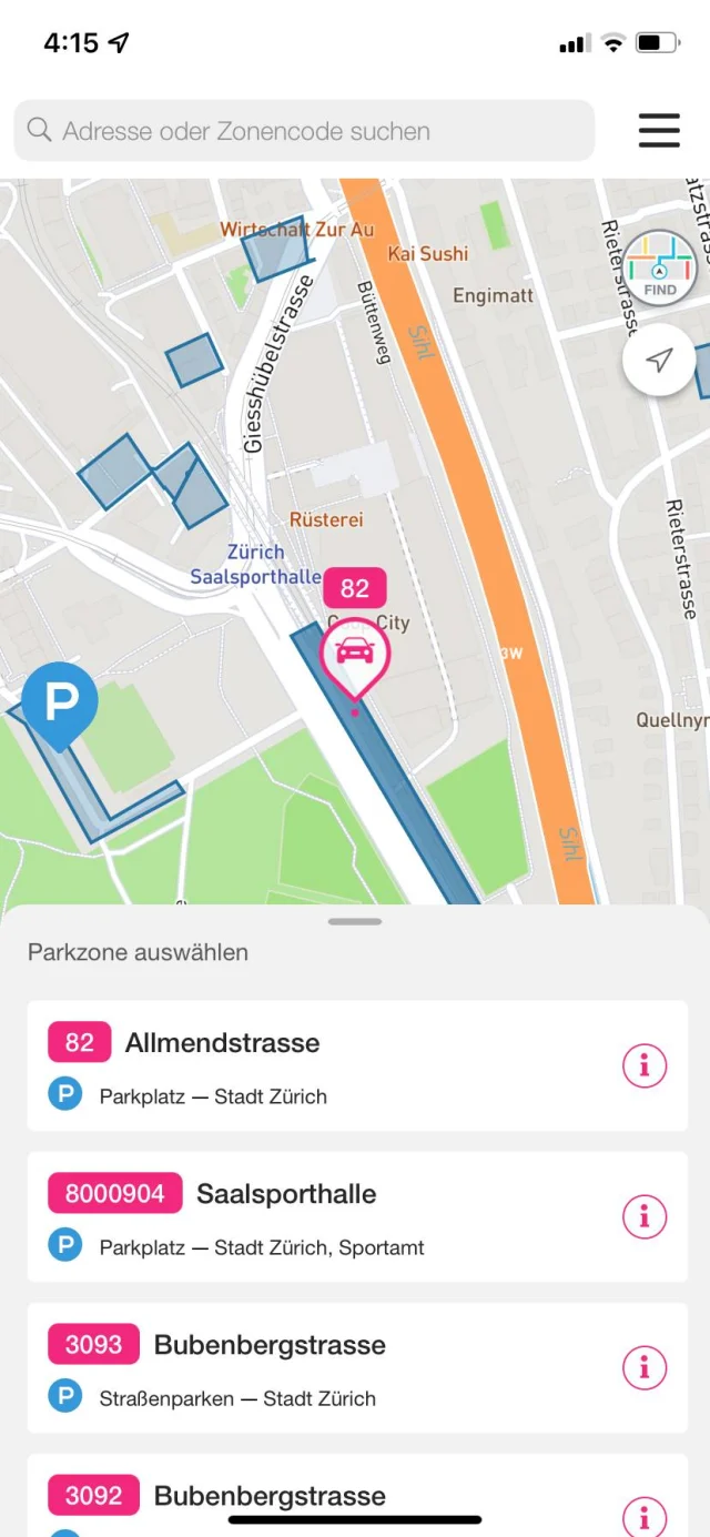 Bild 3: Eine Kartenansicht gibt es bei «ParkingPay» nicht, aber das Angebot ist gross