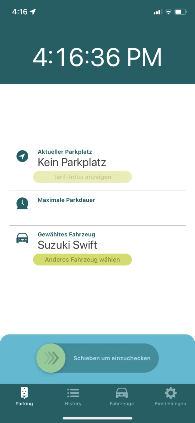 Quelle: Screenshot/PCtipp.chSie schieben lediglich den Check-in-Schalter nach rechts. Vor dem Losfahren schieben Sie den Schalter wieder nach links. «Sepp» rechnet minutengenau ab, was Sie dem Parkplatzbetreiber schulden. Allfällige Maximalparkierzeiten sind in der App eingeblendet und Sie können sich regelmässig per Benachrichtigung erinnern lassen.