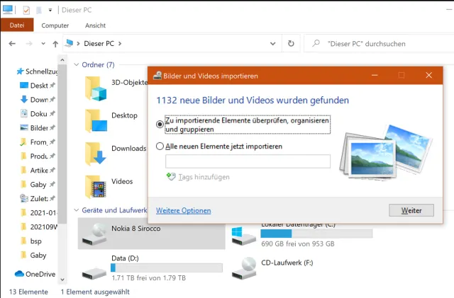 ● Soll sich Windows 10 (oder 11) einfach alle Bilder holen, damit Sie diese später aussortieren? Klicken Sie mit der rechten Maustaste auf den Gerätenamen und wählen Sie Bilder und Videos importieren. Windows durchsucht das Gerät nach Bild- und Videomaterial und bietet Ihnen einen Import an. Bestimmen Sie, ob Sie die Objekte beim Import organisieren wollen oder ob Windows diese vorerst alle in einem Rutsch übernehmen soll. Benutzen Sie Weitere Optionen, um den Zielordner festzulegen, Bild 2.