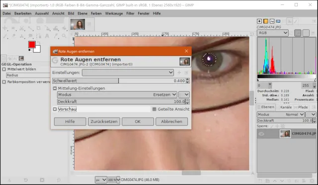 Bild 9: Wie die meisten Fotobearbeitungsprogramme bietet auch Gimp ein Korrekturwerkzeug gegen rote Blitzpupillen