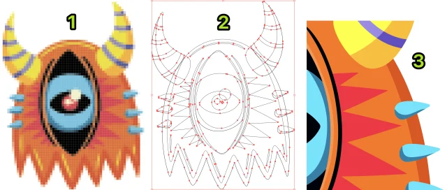 Im Gegensatz zu Bitmaps (links) sind Vektor-Grafiken mathematisch definiert (Mitte) und sehen deshalb in jeder Vergrösserung makellos aus