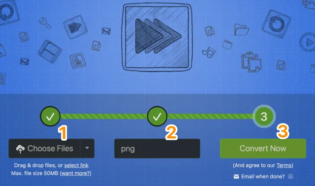 Laden Sie die Bilder über die Schaltfläche Choose File oder ziehen Sie die Dateien einfach in das Browser-Fenster. (1) Wählen Sie das gewünschte Ausgabeformat (2) und klicken Sie zu guter Letzt auf die Schaltfläche Convert Now (3).