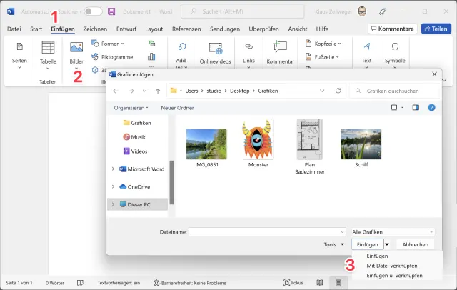 Wenn die Bilder im gewünschten Format vorliegen, können sie auf zwei Arten importiert werden: Entweder wird die ganze Datei komplett in die Word-Datei aufgenommen – oder Sie verweisen lediglich auf den Speicherort des Bildes. Auch eine Mischung aus beiden Verfahren ist möglich.Wählen Sie die gewünschte Vorgehensweise, indem Sie zum Bereich Einfügen (1) wechseln. Wählen Sie im Einblendmenü Bilder (2) den Befehl Dieses Gerät. Jetzt wählen Sie vor dem Import über das Einblendmenü Einfügen (3) die gewünschte Methode: