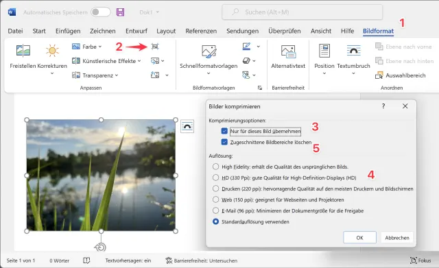 Quelle: PCtipp.chBilder manuell komprimieren. Klicken Sie auf ein Foto, um den Bereich Format einzublenden. (1) Über die Schaltfläche Bilder komprimieren (2) gelangen Sie zu den Einstellungen für die Kompression, die Sie auf das aktuelle oder auf alle Bilder im Dokument anwenden können. (3) Wählen Sie dazu die gewünschte Ausgabequalität. (4) Wenn Sie häufig Bilder zuschneiden, hat die Option Zugeschnittene Bildbereiche löschen (5) ebenfalls einen grossen Einfluss auf die Dateigrösse: In diesem Fall werden alle abgeschnittenen Teile dauerhaft gelöscht. Deshalb kann eine Ausschnittsvergrösserung nicht mehr rückgängig gemacht werden.