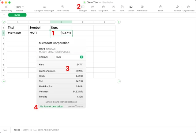 Klicken Sie dazu in eine Zelle (1) und anschliessend auf das Symbol Einfügen (2). Geben Sie das Symbol für den gewünschten Titel ein, in diesem Fall MSFT für Microsoft. Nun sehen Sie den aktuellen Kurs und viele andere Attribute (3). Um damit ohne Umwege direkt in der aktuellen Zelle zu rechnen, wählen Sie zuerst das Attribut und klicken anschliessend ganz unten in diesem Einblendmenü auf den Befehl Als Formel bearbeiten (4).