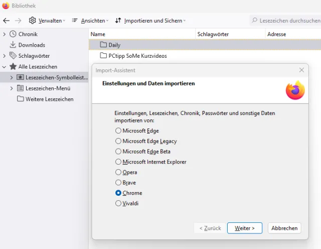 Bookmarks von Chrome/Edge/Brave/Opera/Vivaldi in Firefox importieren