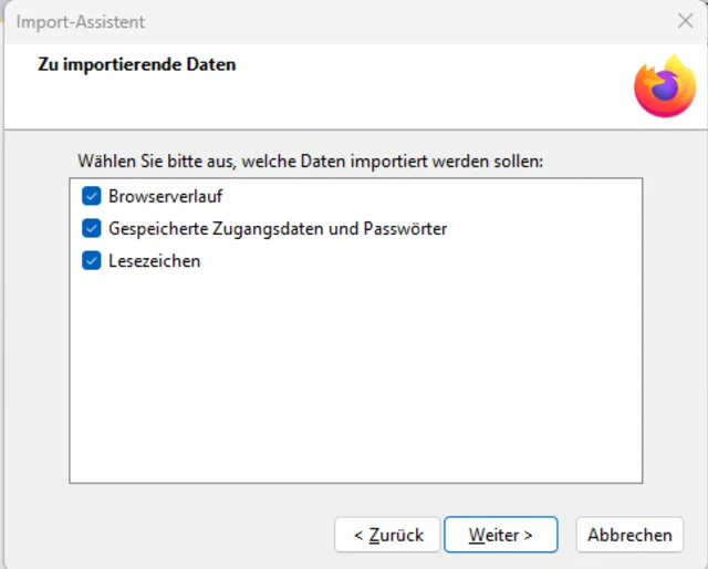 Via Import-Assistent können Sie wählen, von welchem Browser die Einstellungen, Lesezeichen, Chronik, Passwörter etc. importiert werden sollen.