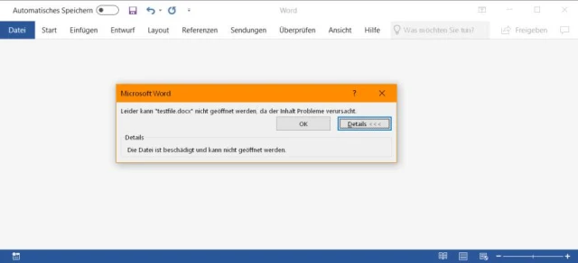 Aufgrund der Dateiendung hält Word es weiterhin für .docx, obwohl es ein HTML-Dokument ist – und gibt Fehler aus