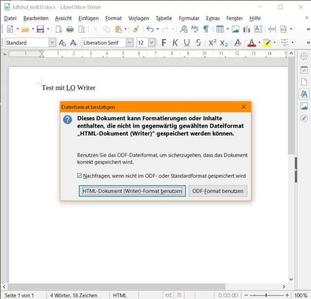 Öffnen Sie diese Datei in LibreOffice und tippen Sie etwas Text ein; ein paar Buchstaben reichen. Nun schlägt der Bug erstmals zu: Wenn Sie diese Datei speichern, erscheint eine Rückfrage, die nur das Speichern als HTML-Datei oder als ODF-Datei anbietet. Keine Spur des ursprünglich via Rechtsklick und Neu ausgewählten Word-Formats «docx»!
