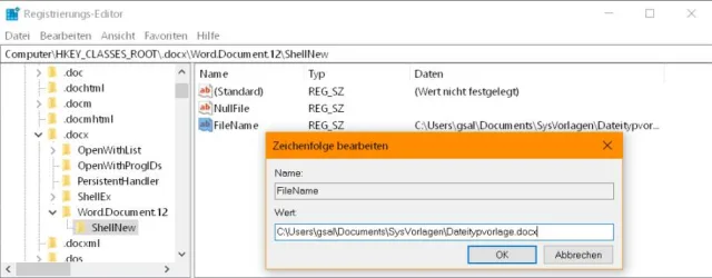 Doppelklicken Sie den neuen Eintrag FileName und tragen Sie im «Wert»-Feld den genauen Pfad zur Vorlagendatei ein. Bei uns wäre das etwa dieser, bei Ihnen heisst er wohl anders: