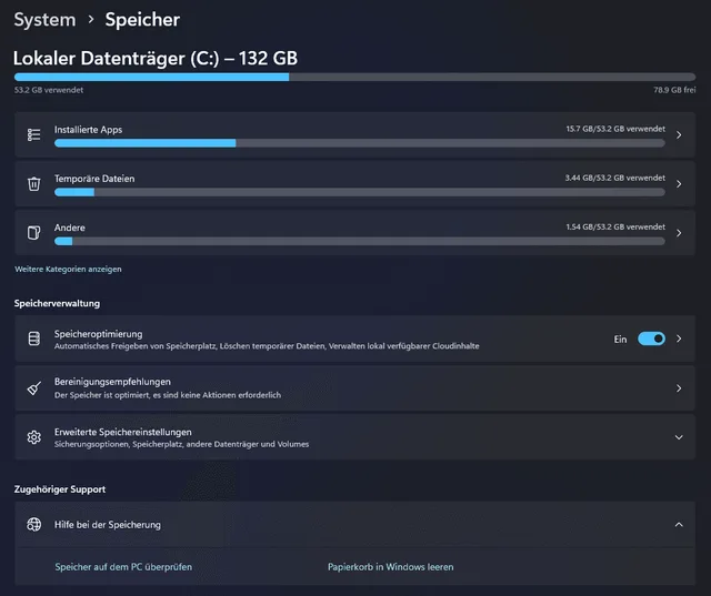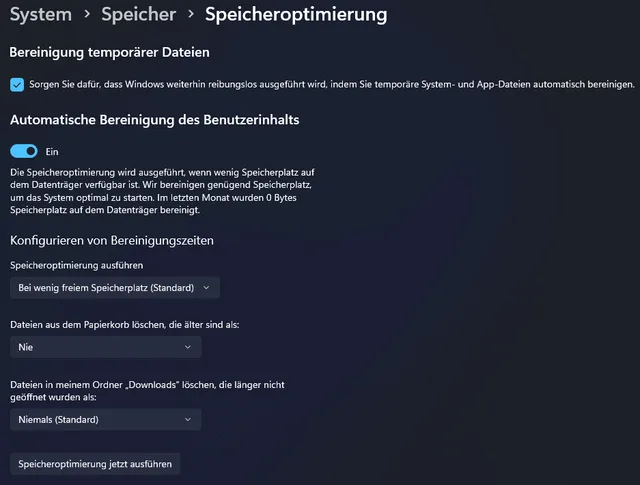 Wenn also nicht CCleaner, was dann? Schliesslich soll der PC ja sauber und aufgeräumt sein. Die einfachste Option ist es, Windows die Arbeit machen zu lassen. Unter Windows 11 gibt es die sogenannte Speicheroptimierung (zu finden via Menüpunkt Einstellungen/System/Speicher).