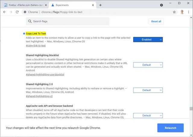 So gehts: Öffnen Sie in Google Chrome die Adresse chrome://flags (in Edge ist es edge://flags/). Filtern Sie darin die Einträge nach der Zeichenfolge copy, damit unter anderem Copy Link To Text stehenbleibt. Aktivieren Sie die Funktion über die dahinter befindliche Schaltfläche, die Sie auf Enabled stellen und klicken Sie unten rechts auf Relaunch.