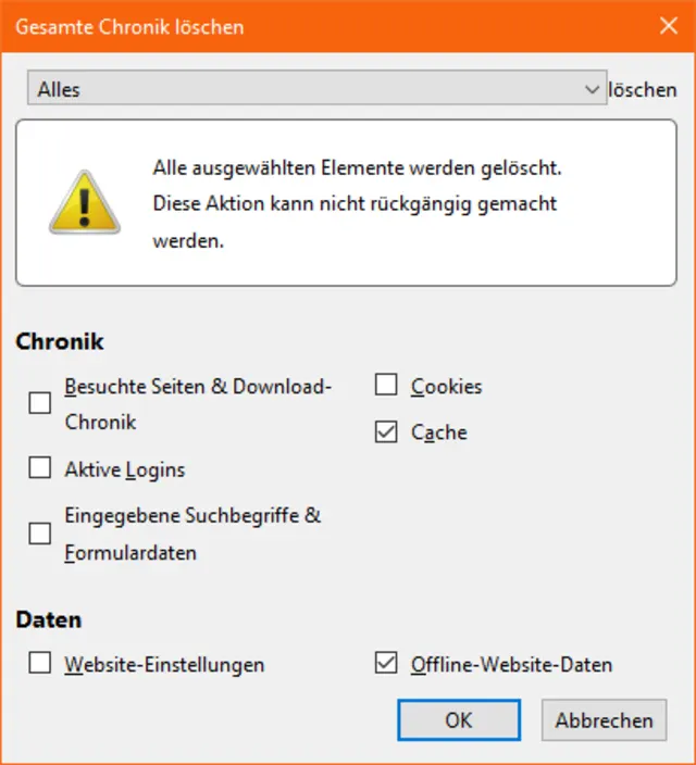 Im Firefox gehts via Firefox-Menü (drei Striche) oben rechts zu Bibliothek/Chronik/Neuste Chronik löschen. Aktivieren Sie auch da nur den Cache und klicken Sie auf OK.