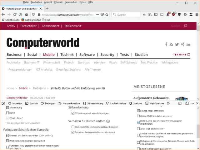 Im Firefox öffnen Sie oben rechts das Drei-Striche-Menü, gehen zu Webentwickler/Werkzeuge ein-/ausblenden; alternativ drücken Sie Ctrl+Shift+i (Strg+Umschalt+i). Oben rechts im Tools-Kasten gehts übers Drei-Punkte-Menü zu den Einstellungen. Sie finden in der hinteren Spalte die Einstellung HTTP-Cache bei offenem Werkzeugkasten deaktivieren. Knipsen Sie diese Einstellung an. Sie bedeutet: Solange der Kasten mit den Entwicklertools geöffnet ist, wird Firefox sich nicht auf die Daten im Cache verlassen. Ziehen Sie den Bereich mit den Entwicklertools etwas kleiner, damit der Kasten nicht im Weg ist und laden und prüfen Sie Ihre Webseite erneut.