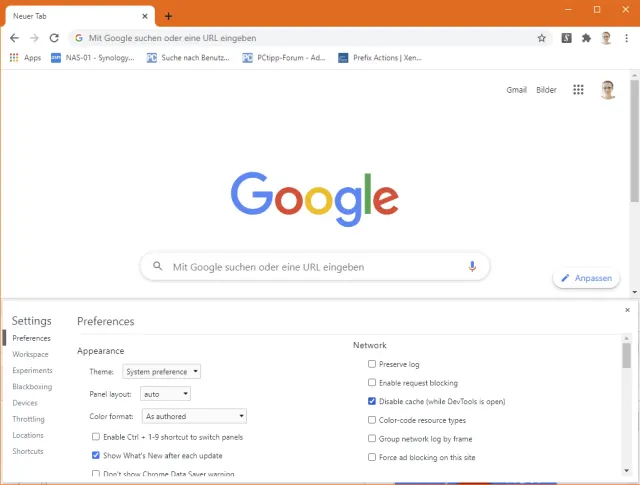 In Chrome gehts fast gleich. Öffnen Sie das Drei-Punkte-Menü/Weitere Tools/Entwicklertools oder drücken Sie Ctrl+Shift+i (Strg+Umschalt+i). Auch da erscheint ein Kasten. Oben rechts des Kastens lässt sich über das Drei-Punkte-Menü via Dock side festlegen, dass der Kasten unterhalb der Webseite erscheint. Klicken Sie im oberen rechten Bereich des Kastens aufs Zahnrad-Icon und aktivieren Sie bei Preferences in der Spalte Network den Punkt Disable cache (while DevTools is open).