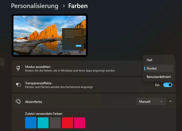 Der zweite potenzielle Hebel ist der dunkle Modus oder Dark Mode. Er spart Energie auf Geräten mit OLED-Displays, da schwarze Pixel komplett ausgeschaltet werden und somit keinen Strom verbrauchen. LCDs profitieren kaum, da sie eine Hintergrundbeleuchtung haben, die immer an ist. Um in den dunklen Modus zu wechseln, gehen Sie in den Einstellungen zu Personalisierung. Dort haben Sie unter Modus auswählen die Wahl zwischen Dunkel, Hell und Benutzerdefiniert, Bild 3.