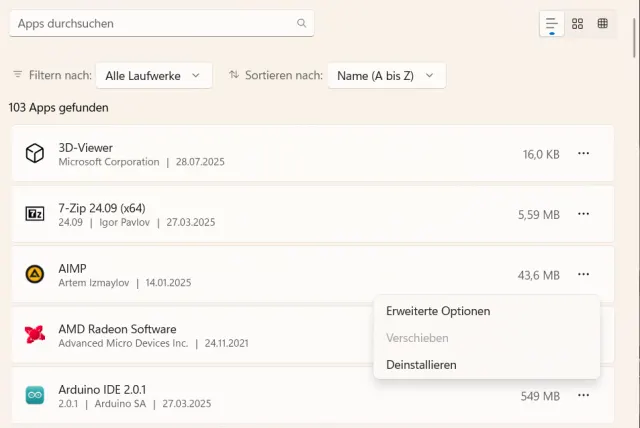 Um die Hintergrundaktivität zu verwalten, öffnen Sie die Windows-Einstellungen und wechseln zum Abschnitt Apps und zu Installierte Apps. Suchen Sie die App, deren Aktivitäten Sie verändern wollen und klicken Sie auf die drei Punkte daneben. Wählen Sie Erweiterte Optionen aus dem Menü, Bild 6.