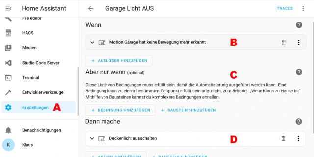 Eine Automation wird in den Einstellungen, Bild 7 A, im Bereich Automatisierungen & Szenen erstellt. Zu Beginn wird dieser Bereich leer sein. Mit einem Klick auf die Schaltfläche Automatisierung erstellen wird sich das gleich ändern. Im folgenden Dialog wird auf Neue Automatisierung erstellen geklickt. Nun sehen Sie ein Dialogfeld, in dem der Auslöser B, eine optionale Bedingung C und die Aktion D definiert werden. Klicken Sie zuerst auf den Auslöser und wählen Sie als Auslösetyp Gerät. Der Rest ergibt sich fast von allein, weil HA anschliessend alle Geräte und Entitäten heraussucht.
