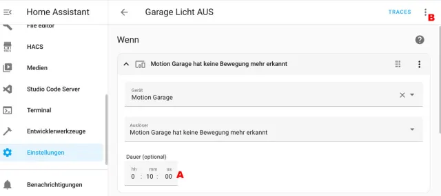 Quelle: PCtipp.chEin Beispiel: Wenn der Bewegungsmelder in der Garage während zehn Minuten keine Bewegung registriert, soll sich das Licht ausschalten. Das Feld für die Zeitangabe wird automatisch eingeblendet, Bild 8 A.