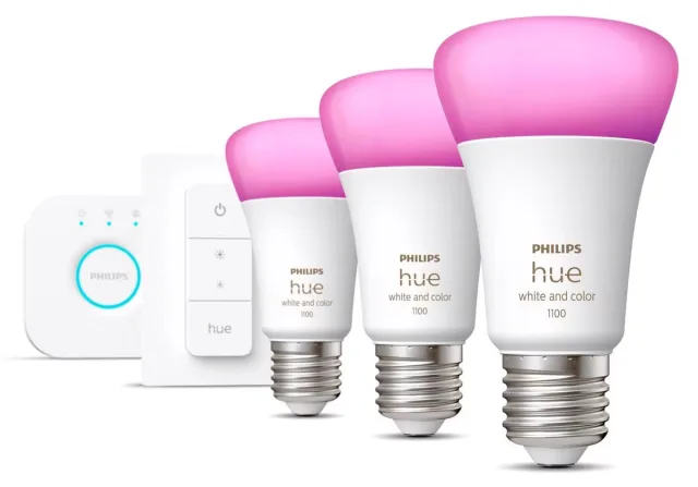 Bild 9: Das Kit mit der Bridge (Basisstation), einem Schalter und drei Leuchtmitteln mit E27-Gewinde kostet bei brack.ch Fr. 159.60