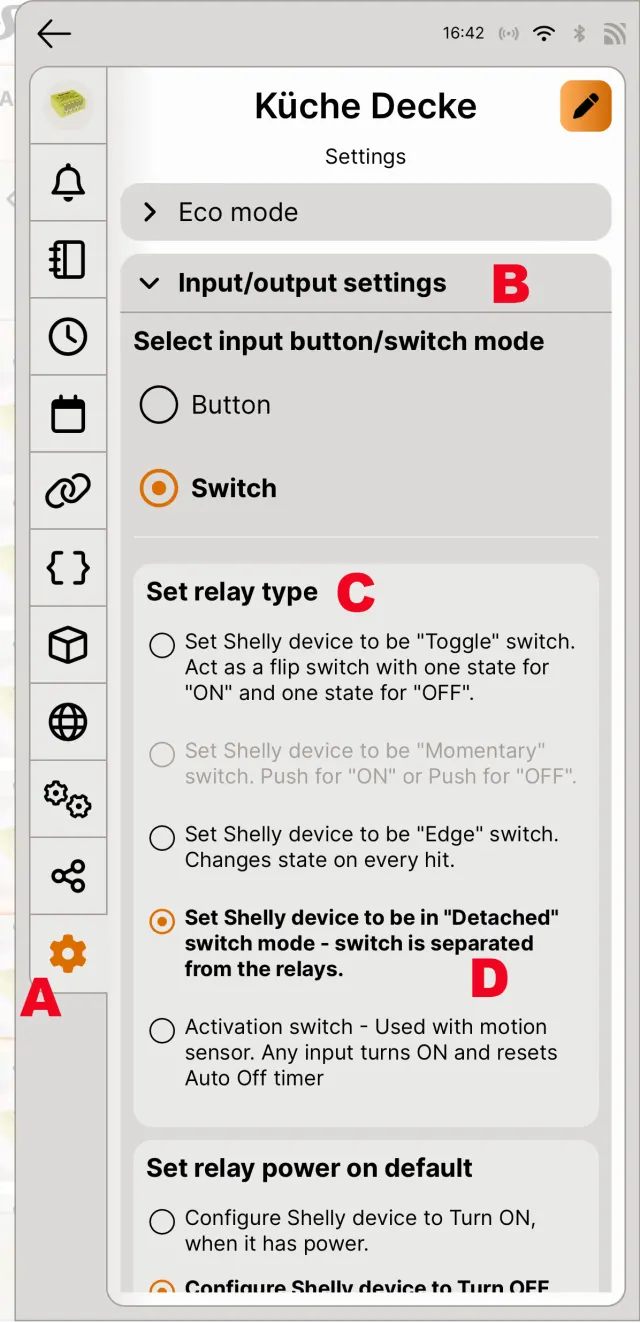 Quelle: PCtipp.chDie Lösung: Öffnen Sie den gewünschten Shelly in der Shelly-App. Tippen Sie auf das Zahnrad, Bild 12 A, und öffnen Sie die Einstellung Input/output settings B. Versetzen Sie den Shelly unter Set relay type C in den Modus Detached D. Jetzt wird immer Strom durchgelassen, damit die smarten Leuchtmittel stets erreichbar bleiben. Trotzdem wird ein Schalterdruck vom Shelly registriert, damit in HA eine Aktion ausgelöst werden kann. Das heisst also, von nun an steuern Sie das Leuchtmittel immer in HA. Der bestehende Schalter hat dabei lediglich die Funktion eines Auslösers, der eine Aktion in HA in Gang setzt.