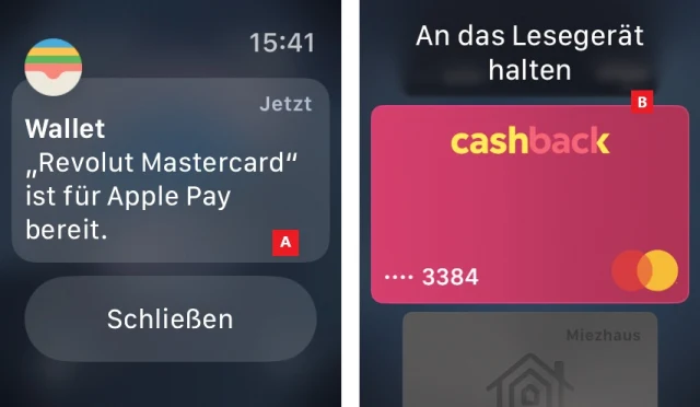 Als nächstes geht es der Brieftasche an den Kragen – mit all den Karten, die es sich darin bequem gemacht haben. Denn das Bezahlen mit Apple Pay ist eine der Kernfunktionen der Apple Watch. Wer diesen Komfort einmal erfahren hat, kann nicht mehr zurück. Denn heute beharrt kaum noch ein Geschäft auf Bargeld, auch nicht bei kleinsten Beträgen.Heute bietet jede namhafte Kredit- und Debitkarte die Anbindung an Apple Pay – und wenn nicht, wird es höchste Zeit für einen Wechsel. Die Karten werden am iPhone in der AppWallet hinterlegt und anschliessend an der Apple Watch aktiviert, Bild 2 A. Sie erwachen für den Zahlungsvorgang, indem die Seitentaste zweimal angetippt wird B. Zu den besonderen Eigenschaften von Apple Pay gehört auch, dass beim Bezahlen nie die PIN verlangt wird, egal wie hoch der Betrag ist. Denn die PIN muss ja bereits eingegeben werden, um die Apple Watch beim Anlegen zu entsperren.