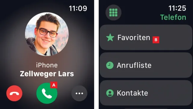 Einmal eingerichtet, wird die Apple Watch zum Telefon, das unter derselben Nummer erreichbar ist. Anrufe werden einfach mit einem Tipp auf das Display angenommen, Bild 1 A. Danach kann das Gespräch freihändig über die Apple Watch geführt werden. Das gilt sowohl für reguläre Verbindungen als auch für Gespräche via FaceTime.