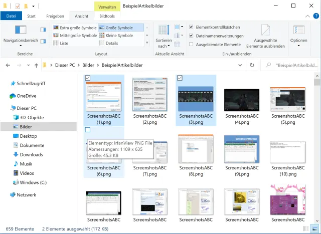 Um einige nicht zusammenhängende Dateien im Windows-Explorer auszwählen, könnten Sie diese mit gedrückter Ctrl- bzw. Strg-Taste nacheinander anklicken. Alternativ haken Sie im Reiter Ansicht die Option Elementkontrollkästchen an. Damit bekommen die Dateien beim Drüberfahren per Maus ein Kästchen, das Sie anhaken können, um einzelne Dateien auszuwählen.
