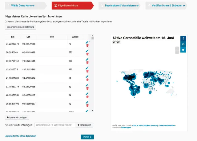Tabelle kopieren oder importieren. Oder aber Sie tragen die Punkte von Hand ein, indem Sie über das Suchfeld nach der Adresse suchen und so die Koordinaten ermitteln. Die Koordinaten können zwei Werten zugeordnet werden. Einer der Werte bestimmt den Durchmesser des Punktes, der zweite die Farbe. Die