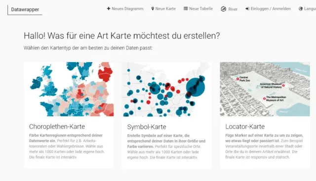 Um loszulegen, öffnen Sie die Website datawrapper.de und klicken auf start creating. Oben auf der Website wählen Sie anschliessend Neue Karte, Bild 7. Als Nächstes bestimmen Sie, welche Art von Karte Sie