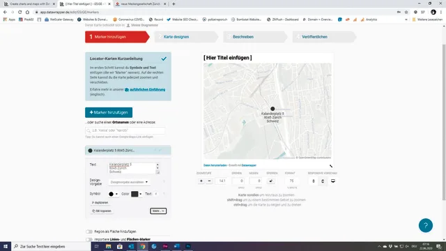 Bei der Symbolkarte wählen Sie zuerst den Kartentyp. Um die Punkte zu platzieren, gibt es hier aber keine Geo-Codes. Sie können frei platziert werden. datawrapper.de verwendet dazu dieselben Koordinaten wie Google Maps, Bild 12. Wenn Ihre Daten bereits mit diesen Angaben aufbereitet sind, können Sie eine