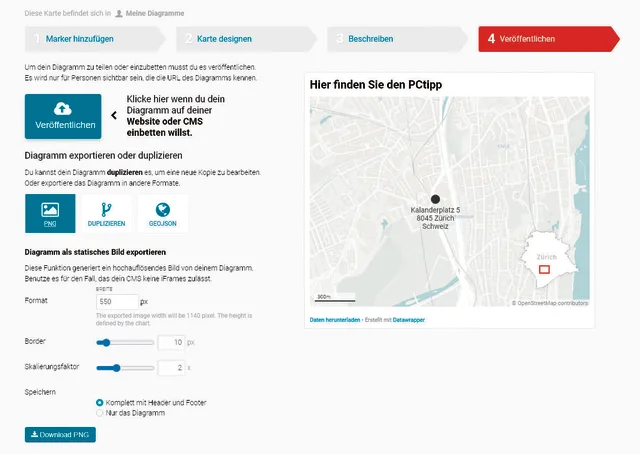 Quelle: Screenshot/PCtipp.chDas Herunterladen und Veröffentlichen der Karte entspricht wiederum dem Vorgehen, wie es bei den anderen datawrapper.de-Karten beschrieben wurde.
