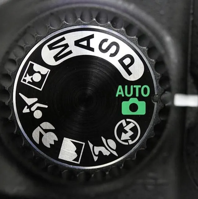 An vielen Kameras befindet sich an der Oberseite ein Moduswählrad, das bestimmt, in welcher Betriebsart die Kamera läuft. Je nach Modus werden manche Einstellungen von der Kamera vorgenommen und andere stellen Sie selbst ein. Die Symbole und Funktionen an diesem Drehrad variieren je nach Marke und Modell; es gibt aber zumindest fünf Modi, die in fast jeder Kamera vorhanden sind: